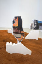 Architecturalement, un autre dialogue s’opère : un croisement entre les héritages industriels et traditionnels si l’on considère le caractère hybride de ses stèles entre formes brutalistes et organiques. Des matériaux de base de construction de nos habitats modernes (des carreaux de plâtres, de la brique rouge) servent à la mise en œuvre d’une architecture cosmique qui rappelle les premiers édifices constitués de monolithes, érigés symboliquement comme des antennes telluriques pour communiquer ou capter les énergies célestes. En mariant des codes industrialisés à des codes de ralliements localisés, Chemsedine pointe les comportements tribaux qui se perpétuent dans une culture globalisée.