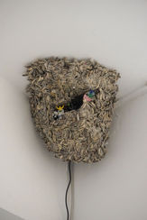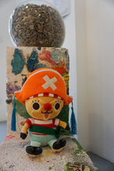 ce qui croise sa route. Les déchets se mêlent aux substances qu’il absorbe frénétiquement, toujours entouré de compagnons en plastique ou en peluche. Plus que des installations, ses œuvres forment un biome vivant, où l’artiste se confond avec son environnement. Il y évolue tantôt comme un micro-organisme, tantôt comme une souris (clic, clic, clic).