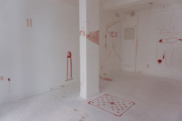 : le dessin s’écrit ici en fil rouge, déposé, collé, tendu, accroché, enroulé, laissant